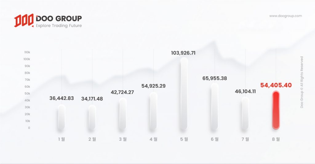 보고서에 따르면 Doo Prime의 2022년 8월 총거래는 약 544.1억 달러로 전월 대비 약 18.01% 증가했고 지난해 같은 기간 268.2억 달러보다 102.9% 증가했습니다. 8월 일 평균 거래량(ADV)은 17.6억 달러로 7월보다 18.01% 증가하였습니다.