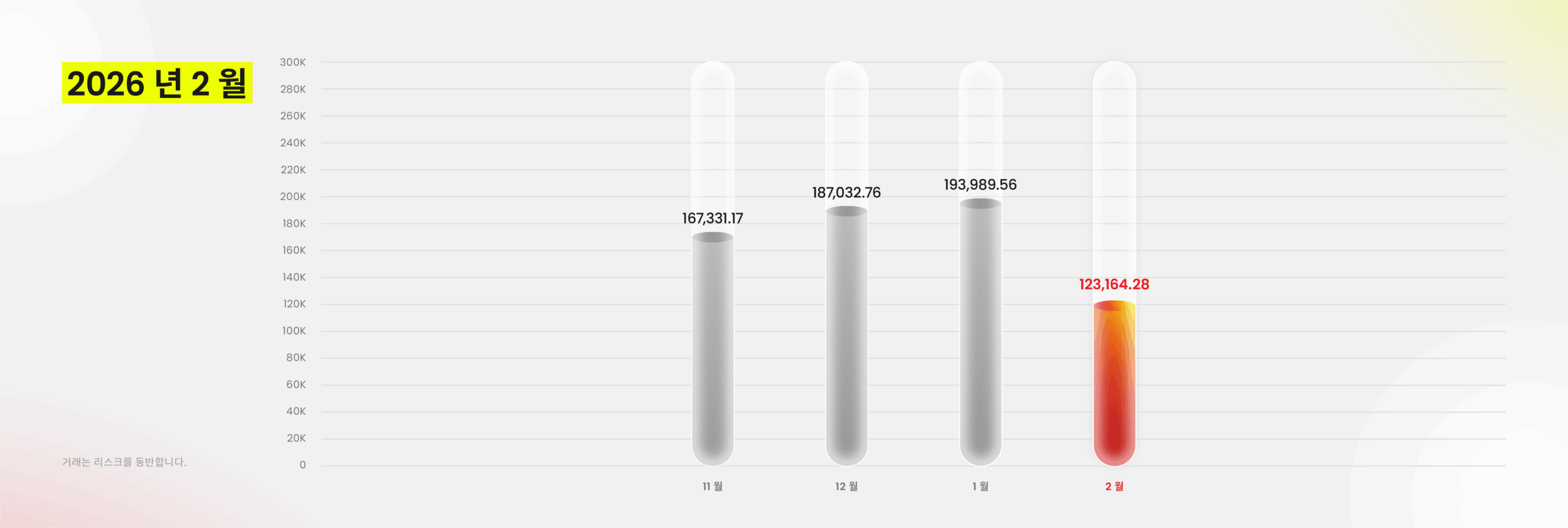 - 2월 총 거래량은 1,231.6억 달러로, 전월 대비 36.51% 감소했습니다.