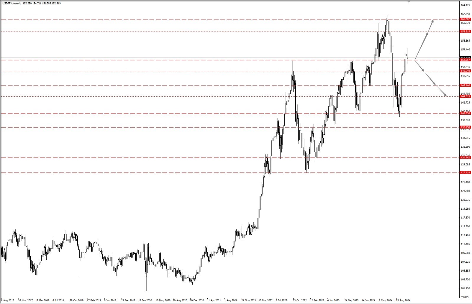 - 如果美日运行于 152.05 一线上方,则依次关注 158.31 和 161.06 两个位置的压制力度;