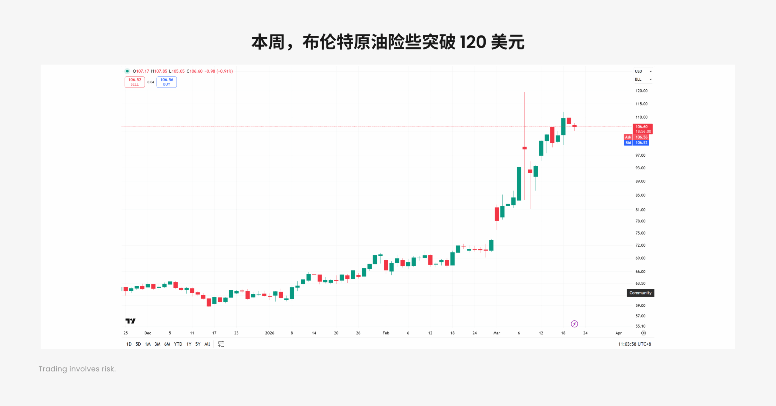 随着中东一声炮响,一切都改变了。本周一,布伦特原油于 106.5 美元处高开,最高接近 120 美元大关,但随着美国国防部长赫格塞思一句“不愿陷入长期战争”而回落,但不改上升趋势。