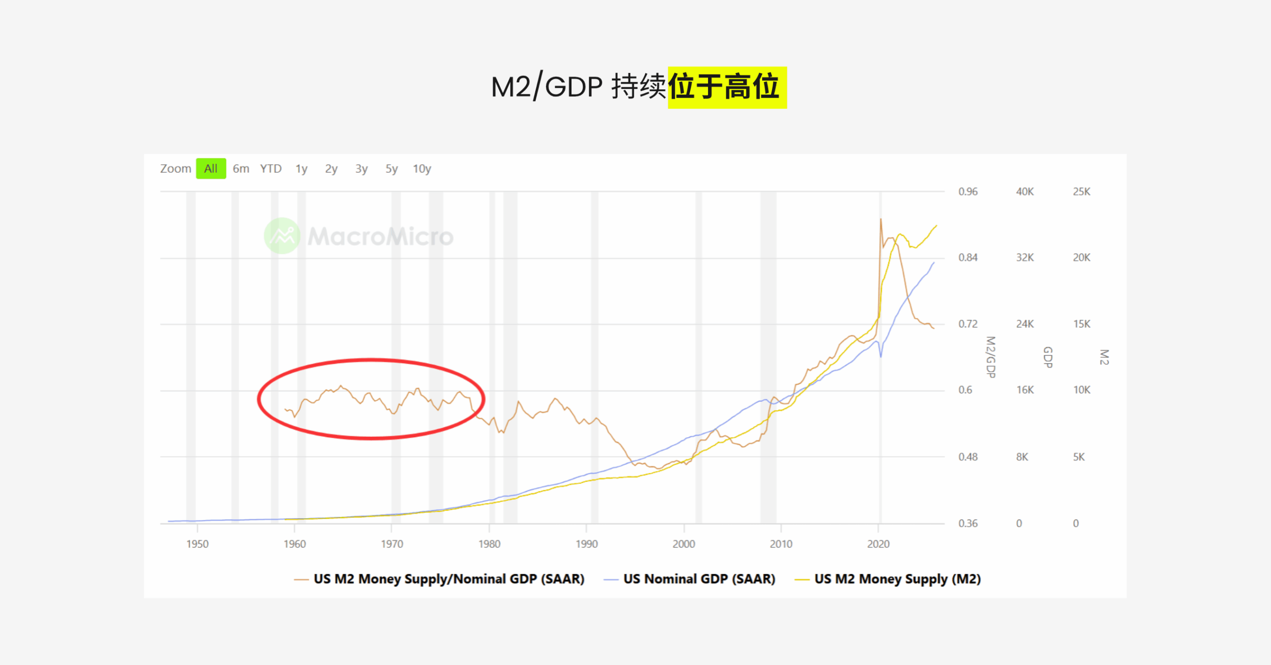 首先是当时货币、财政政策宽松,货币超发所致。这段期间,M2 / GDP 持续位于高位,当时美国政府为了社会福利支出以及应对越南战争,不断扩大财政赤字。近几年来,更为严重的货币超发是在 2020 年疫情期间,当时为了拯救脆弱的经济,不得不进行史无前例的大放水,所以一直到现在,美国还在发愁通胀的问题。