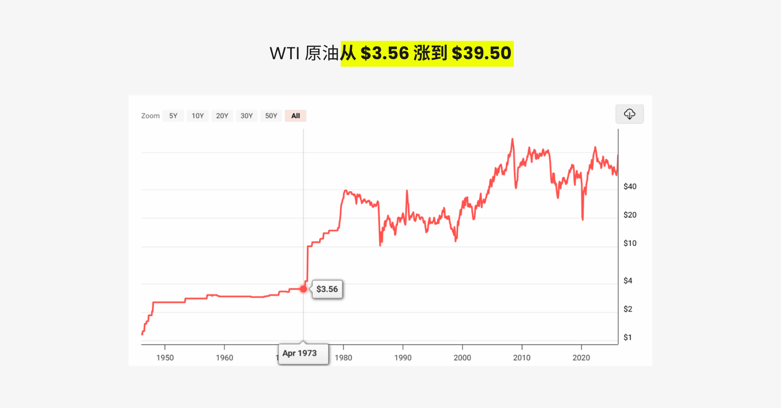 其次是原油,1973 年爆发了第四次中东战争。战前,WTI 油价是每桶 3.56 美元,到了 1980 年中旬,油价高达 39.5 美元/桶,足足翻了 10 倍不止。
