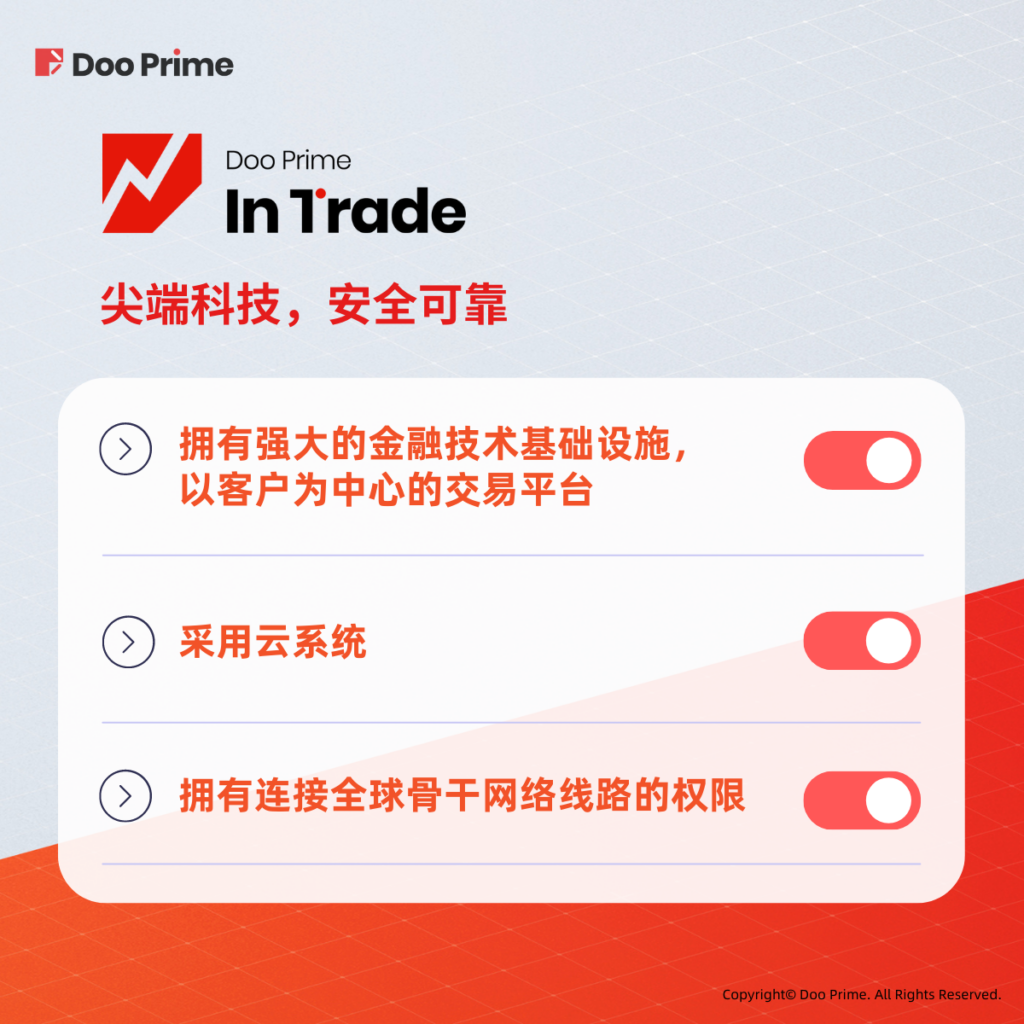 Doo Prime InTrade 由 Doo Prime 联合 FinPoints 共同研发 ,拥有强大的金融技术基础设施。Doo Prime InTrade PC 端和移动端均采用了云端和顶级网络技术,交易平台同时拥有连接全球骨干网络线路的权限,为用户提供了可信赖的稳定交易环境。