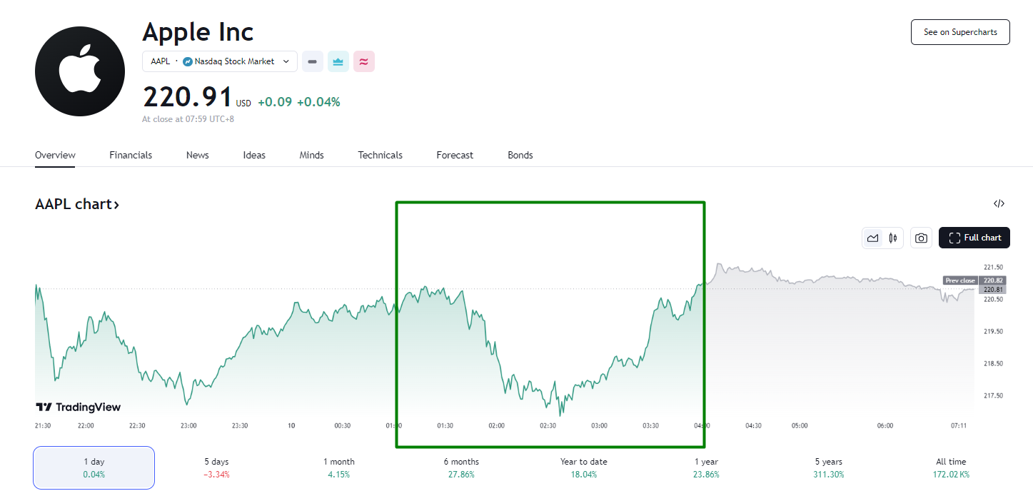 苹果股价先跌后涨,V 型反转后微幅收涨