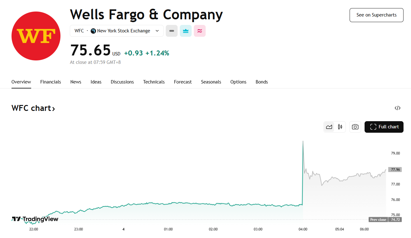 受此消息推动,富国银行股价周二盘后一度大涨逾 10%,截至美东时间下午 5 点,富国银行股价为 77.35 美元,涨幅 2.25%。