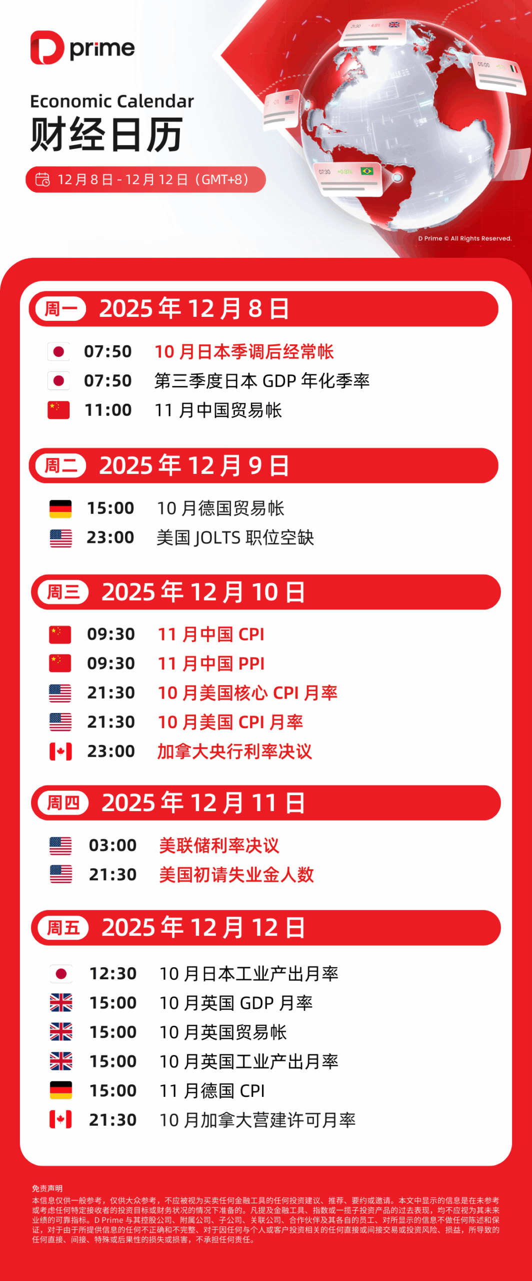 财经日历 | 以下为 2025 年 12 月 8 日至 2025 年 12 月 12 日(GMT+8 北京时间) 全球重大经济事件提醒。在重大行情期间,请确保您已审查您的保证金率,并有足够的保证金来支撑您的风险敞口。