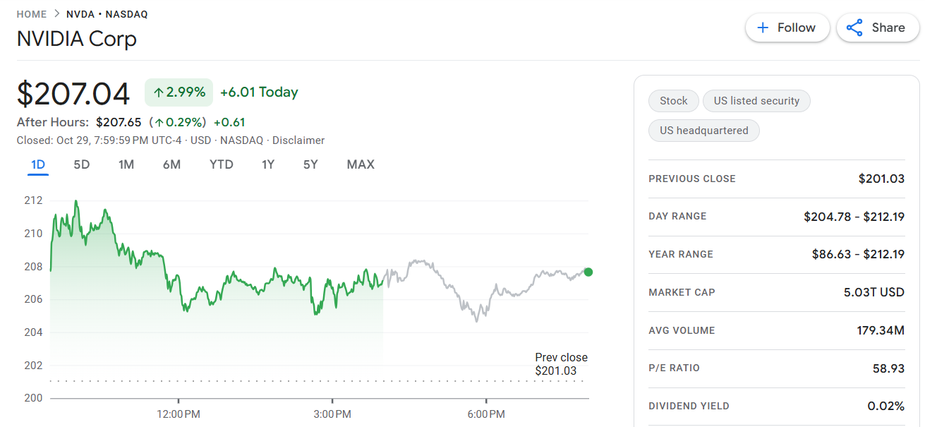 周三美股开盘后,英伟达股价一度触及 212.19 美元的历史新高,随后回落至约 206.15 美元,当日上涨约 2.5%。股价突破每股 206 美元后,英伟达市值首次升至 5 兆美元,成为全球首家达到此里程碑的公司。