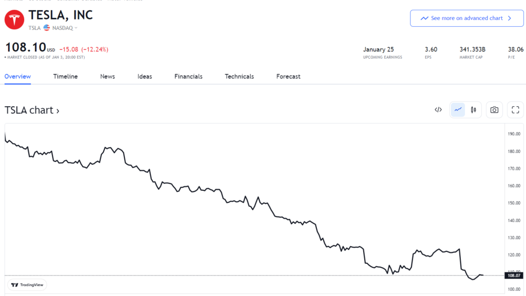 特斯拉盘初暴跌近 10%,盘中最深跌 15%,后跌幅小幅收窄,收跌 12.24%,报 108.10,创逾两年最差表现,同时刷新自 2020 年 8 月份以来盘中最低位 104.64 美元。其市值一夜跌掉近 480 亿美元,现总市值 3413.53 亿美元。