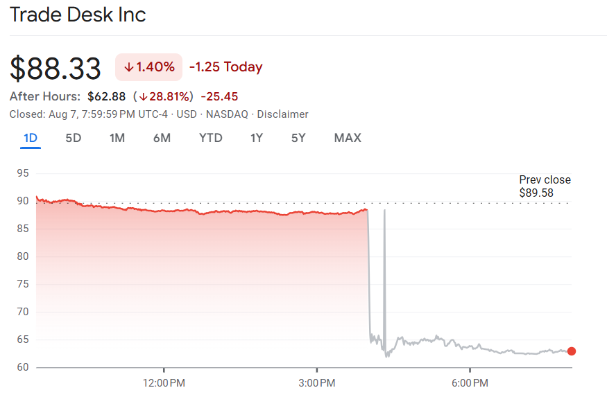 尽管财报表现良好,但The Trade Desk股价随后在盘后交易时段大幅下跌 25.88%。今年以来,该公司股价累计下跌 24%,远逊于同期纳斯达克综合指数上涨 10% 的表现。