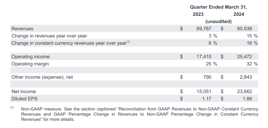 - 总营收 805.4 亿美元,同比增长 15%,创 2022 年初以来最快增速,并高于市场预期的 790.4 亿美元。