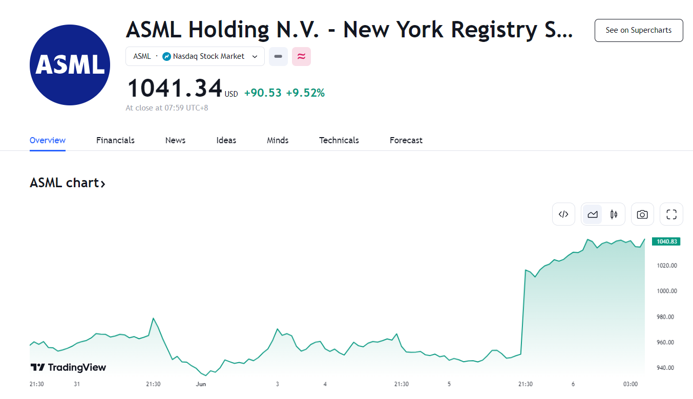 这波涨幅源于荷兰光刻机制造商 ASML 日前表示,将在今年向公司头号大客户——台积电交付其最新的高数值孔径极紫外线光刻机 EUV。据悉,这款设备是 ASML 迄今为止最尖端的产品,其每台高达 3.5 亿欧元的售价也显示了其在行业中的高端地位,因此市场对 ASML 的信心因此得到了极大的提振,带动股价飙涨。