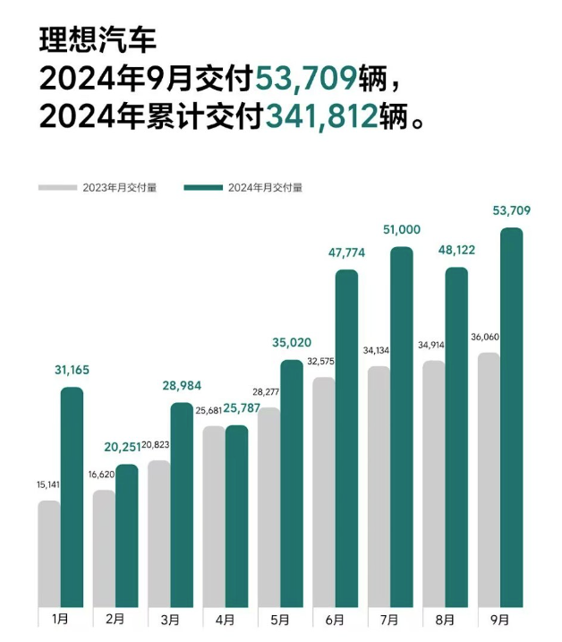 10 月 1 日,电动车 9 月成绩单陆续出炉,其中理想汽车创单月交付量历史新高。具体来看,9 月理想汽车交付新车 53,709 辆,同比增长 48.9%;2024 年第三季度,理想汽车交付 152,831 辆,同比增长 45.4%;截至 2024 年 9 月 30 日,理想汽车 2024 年共交付 341,812 辆;历史累计交付量为 975,176 辆。