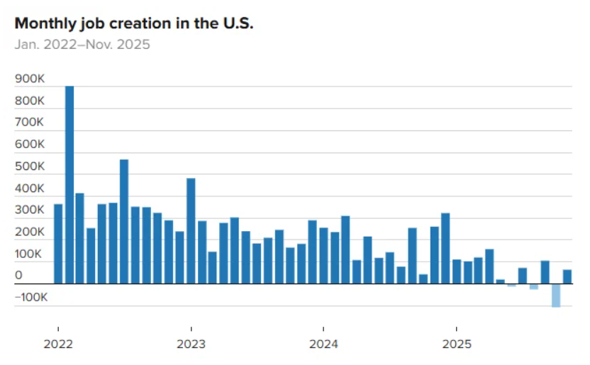 12 月 16 日至 17 日,美国 11 月就业数据显示劳动力市场持续降温,但尚未出现明显失速迹象。非农新增就业人数为 6.4 万人,失业率上升至 4.6%,创 2021 年以来新高。分析指出,本次数据受政府部门裁员及一次性因素影响较大,对经济前景的警示意义有限。