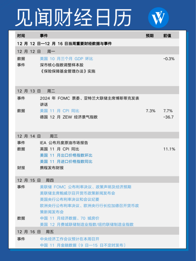 本周将迎来全球多个央行公布年内最后一份利率决议,包括三大央行——美联储、英国央行和欧洲央行,瑞士、挪威、墨西哥和菲律宾国家央行也将相继宣布其加息幅度。此外,本周也有几项重磅经济数据公布:英国将在央行会议之前发布失业金申请人数、GDP 和通胀数据,并在周五报告零售销售;美国本周还将发布 11 月 CPI、费城联储制造业 PMI 和零售销售;欧元区和欧美国家 12 月制造业 PMI 数据也将在本周揭晓。