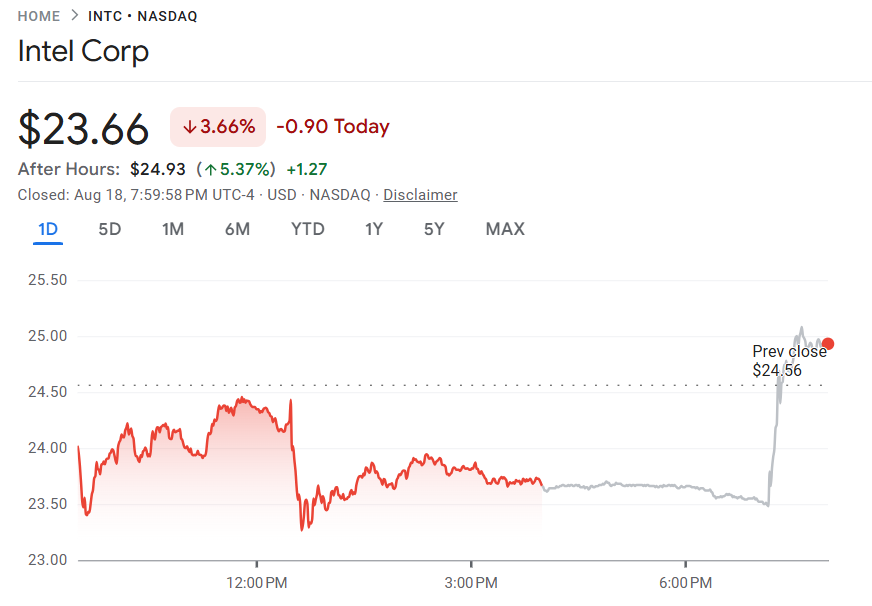 8 月 18 至 19 日, 据多家权威媒体综合报道,美国特朗普政府正与陷入困境的芯片制造商英特尔进行谈判,计划通过政府入股的方式,支持英特尔扩大国内制造能力。这一消息推动英特尔股价盘后大涨 5.37%。