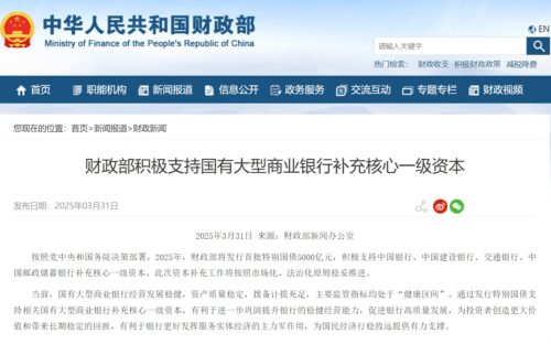3 月 30 日,建设银行、中国银行、交通银行、邮储银行发布公告,拟通过向特定对象发行 A 股股票的形式募集资金。根据四家银行的公告,财政部拟认购的资金总额合计为 5000 亿元。