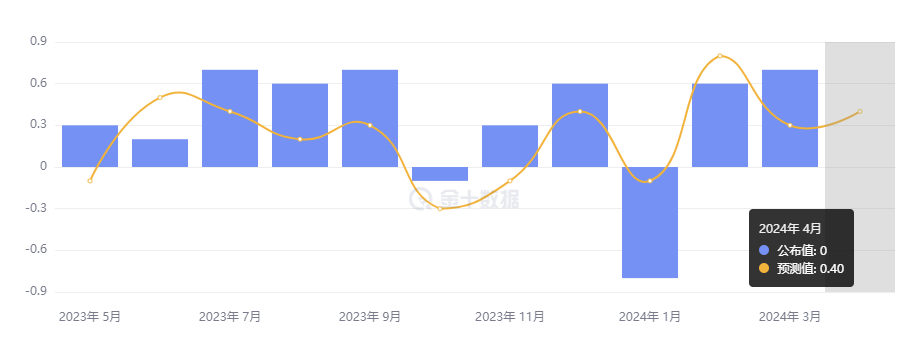美国劳工统计局公布,4 月 CPI 同比增长 3.4%,持平预期,较前值 3.5% 小幅下降;环比增长 0.3%,低于预期和前值 0.4%。