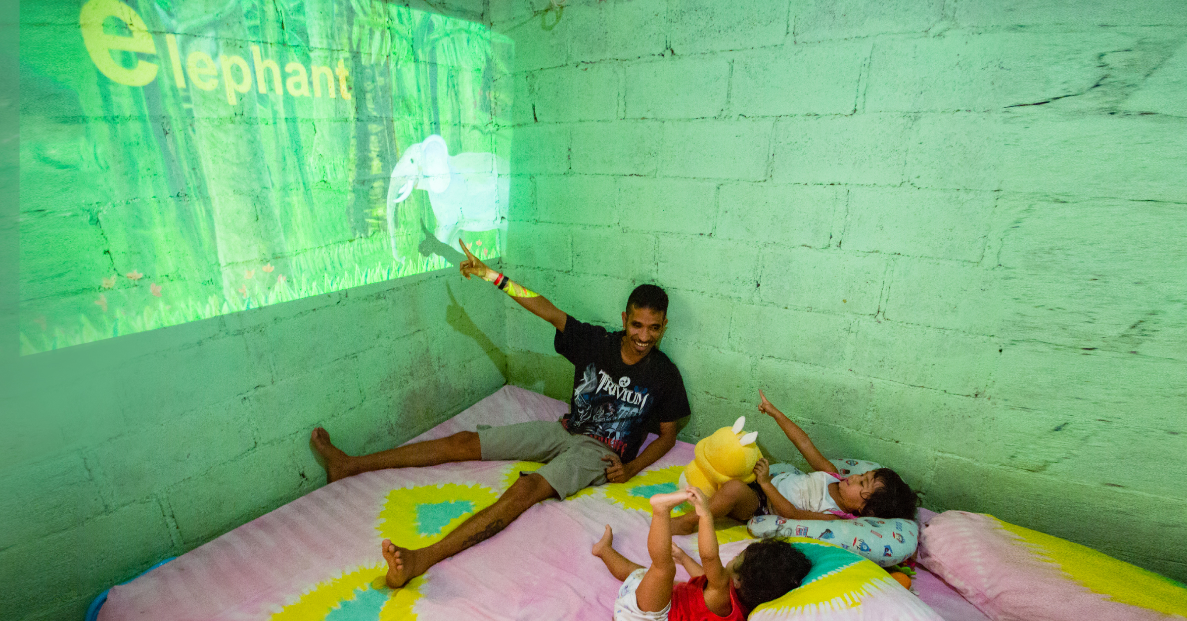Joao Viegas 和他的两个女儿 Soraya Leocadia(2岁)、Gaudencia Kassaruby(1岁)一起看动画片
