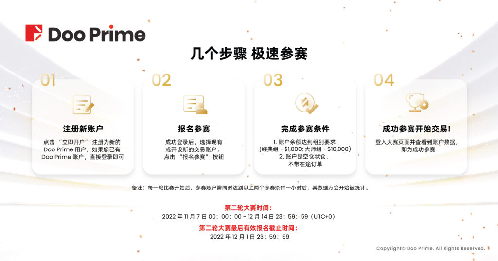 本轮赛事报名将于 2022年 12 月 1 日结束,请各位有识之士把握争取丰厚奖金的最终机会,与来自全球的 #DooTrader 共同携手,共创美好,以公益为内核回馈社会,实现自身价值与理想。