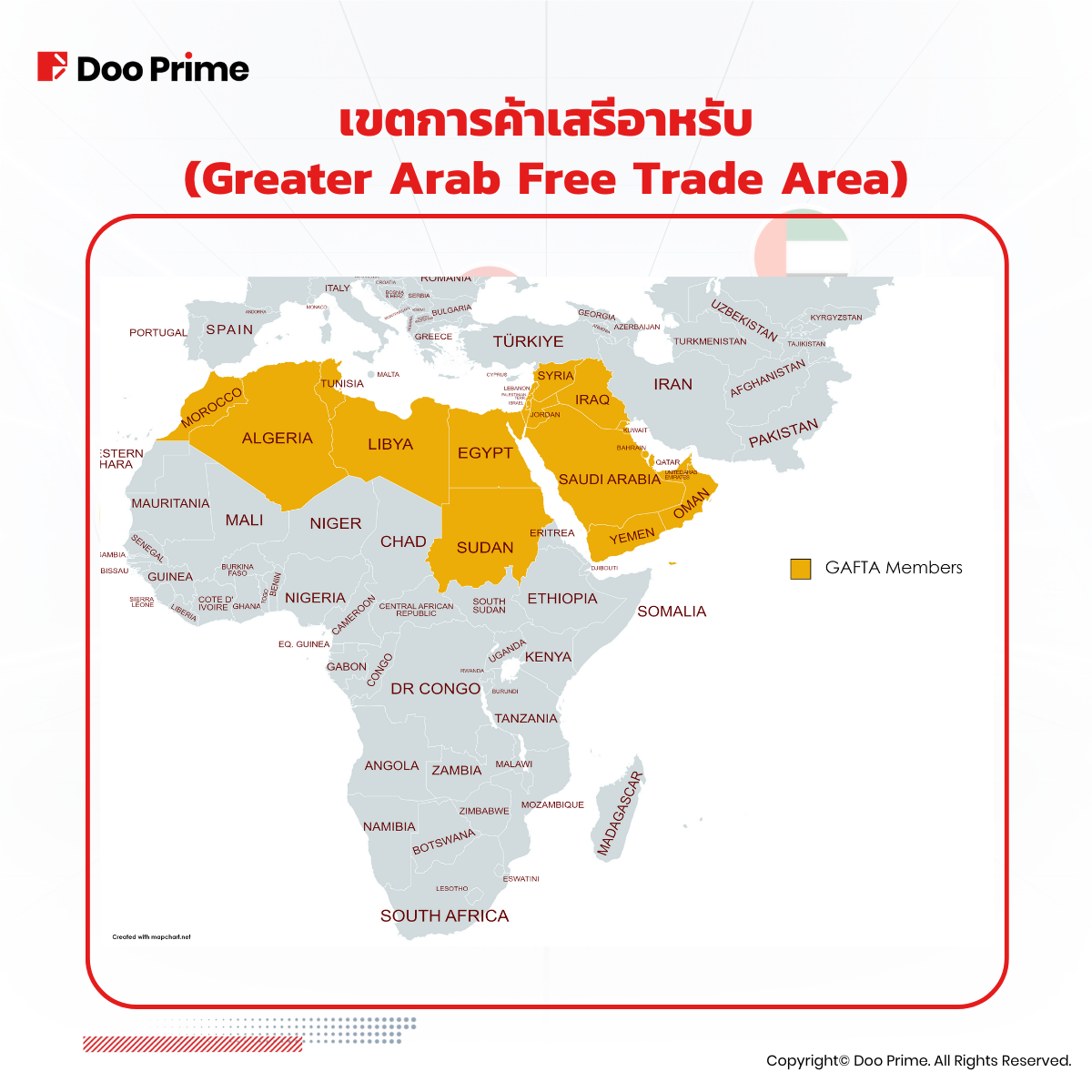 สมาชิกอื่นๆ ของ GAFTA ได้แก่ แอลจีเรีย บาห์เรน อิรัก จอร์แดน คูเวต เลบานอน ลิเบีย โมร็อกโก โอมาน ปาเลสไตน์ กาตาร์ ซูดาน ซีเรีย ตูนิเซีย สหรัฐอาหรับเอมิเรตส์ และเยเมน