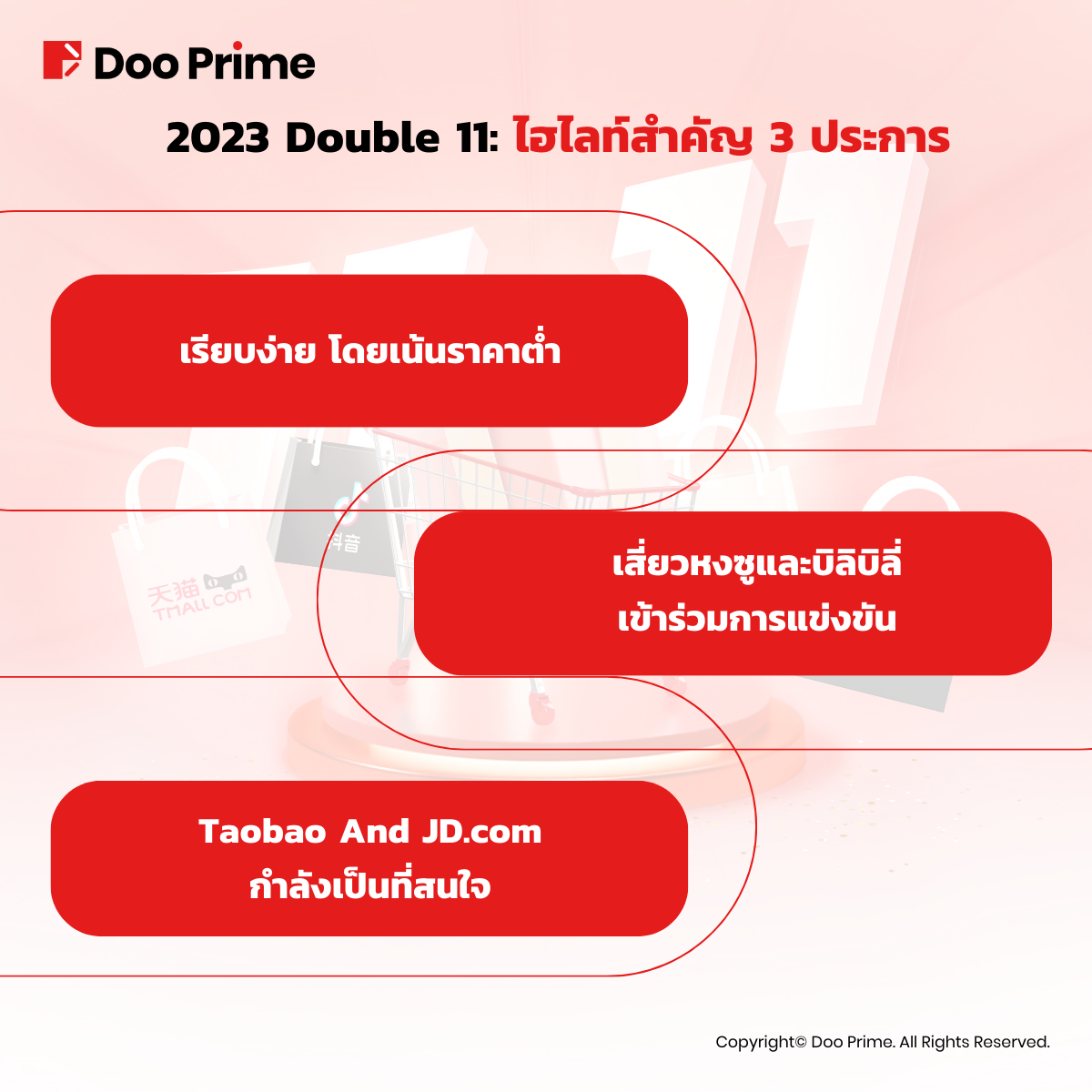 เพื่อฝ่าฟันอุปสรรคในการเติบโต แพลตฟอร์มอีคอมเมิร์ซหลักๆได้หวนคืนสู่ความเรียบง่ายอีกครั้งในเทศกาล Double 11 ปี 2023 โดยเน้นที่การเสนอราคาที่ต่ำอีกครั้ง แคมเปญส่งเสริมการขายเริ่มต้นตั้งแต่วันที่ 23 ของเดือน