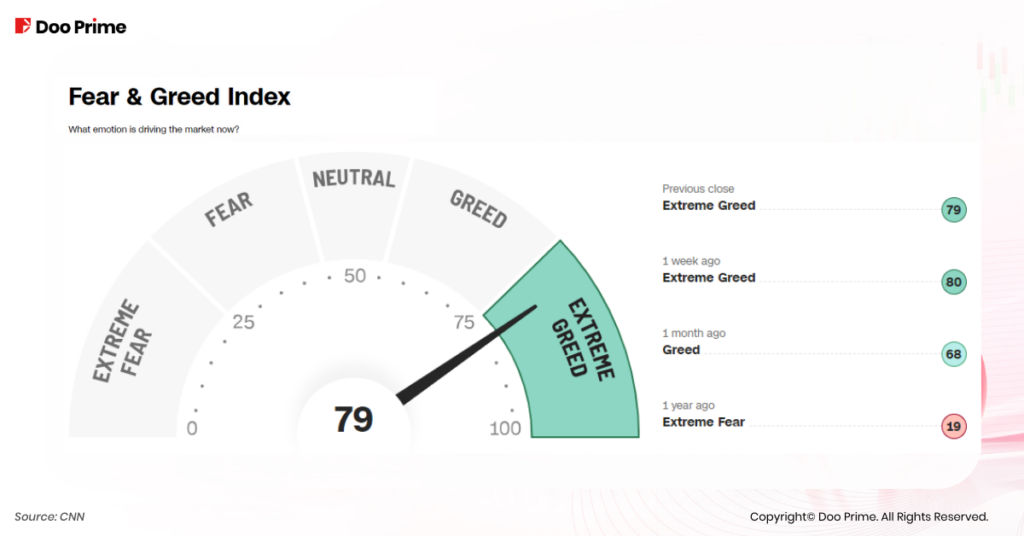 ดัชนีที่ใช้วัดความเชื่อมั่นของตลาด อย่าง ดัชนี “Fear & Greed Index” พุ่งขึ้นเป็น 79 ซึ่งบ่งชี้ถึงระดับความโลภของนักลงทุนที่เพิ่มขึ้น อย่างไรก็ตาม หากขึ้นไปถึง 90 จะบ่งบอกถึง การมองโลกในแง่ดีมากเกินไป และสภาพตลาดที่ร้อนแรง (Market Overheating)