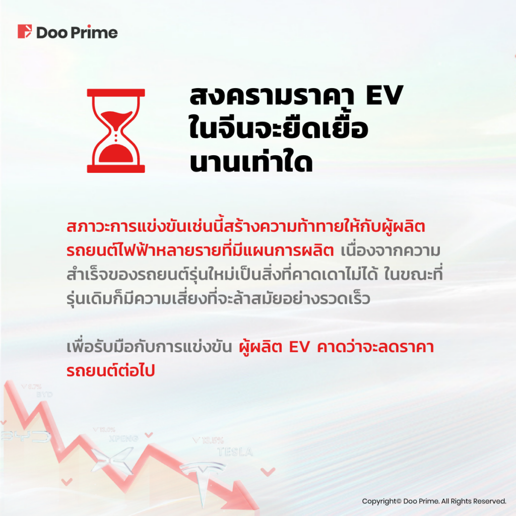 ระยะเวลาของสงครามราคา EV ของจีนยังคงไม่แน่นอนเพราะไม่มีสัญญาณว่าการแข่งขันจะลดลง สภาวะการแข่งขันเช่นนี้สร้างความท้าทายให้กับผู้ผลิตรถยนต์ไฟฟ้าหลายรายที่มีแผนการผลิต เนื่องจากความสำเร็จของรถยนต์รุ่นใหม่เป็นสิ่งที่คาดเดาไม่ได้ ในขณะที่รุ่นเดิมก็มีความเสี่ยงที่จะล้าสมัยอย่างรวดเร็ว ผู้ผลิต EV คาดว่าจะลดราคาต่อไปเพื่อให้แข่งขันได้ ซึ่งนำไปสู่การต่อสู้เพื่อความอยู่รอดอย่างต่อเนื่อง