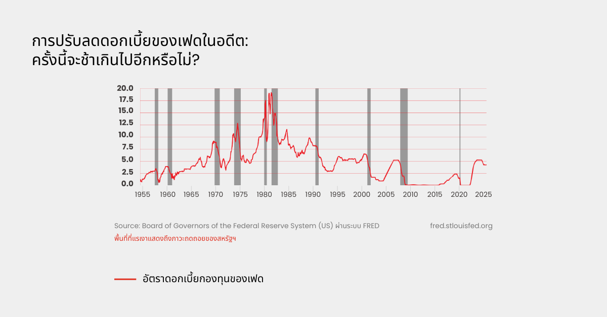 อมูลจาก Federal Reserve Economic Data (FRED) เกี่ยวกับวัฏจักรอัตราดอกเบี้ยในอดีต บอกเล่าเรื่องราวได้อย่างชัดเจน: